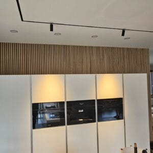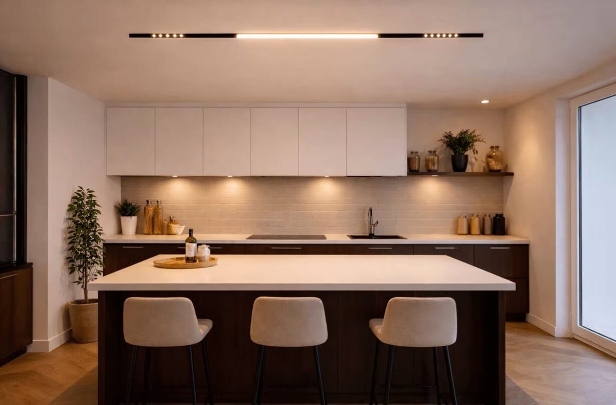 De naadloze aansluiting van de trimless spots op het plafond zorgt voor gelijkmatige belichting die mooi overgaat in natuurlijk licht.