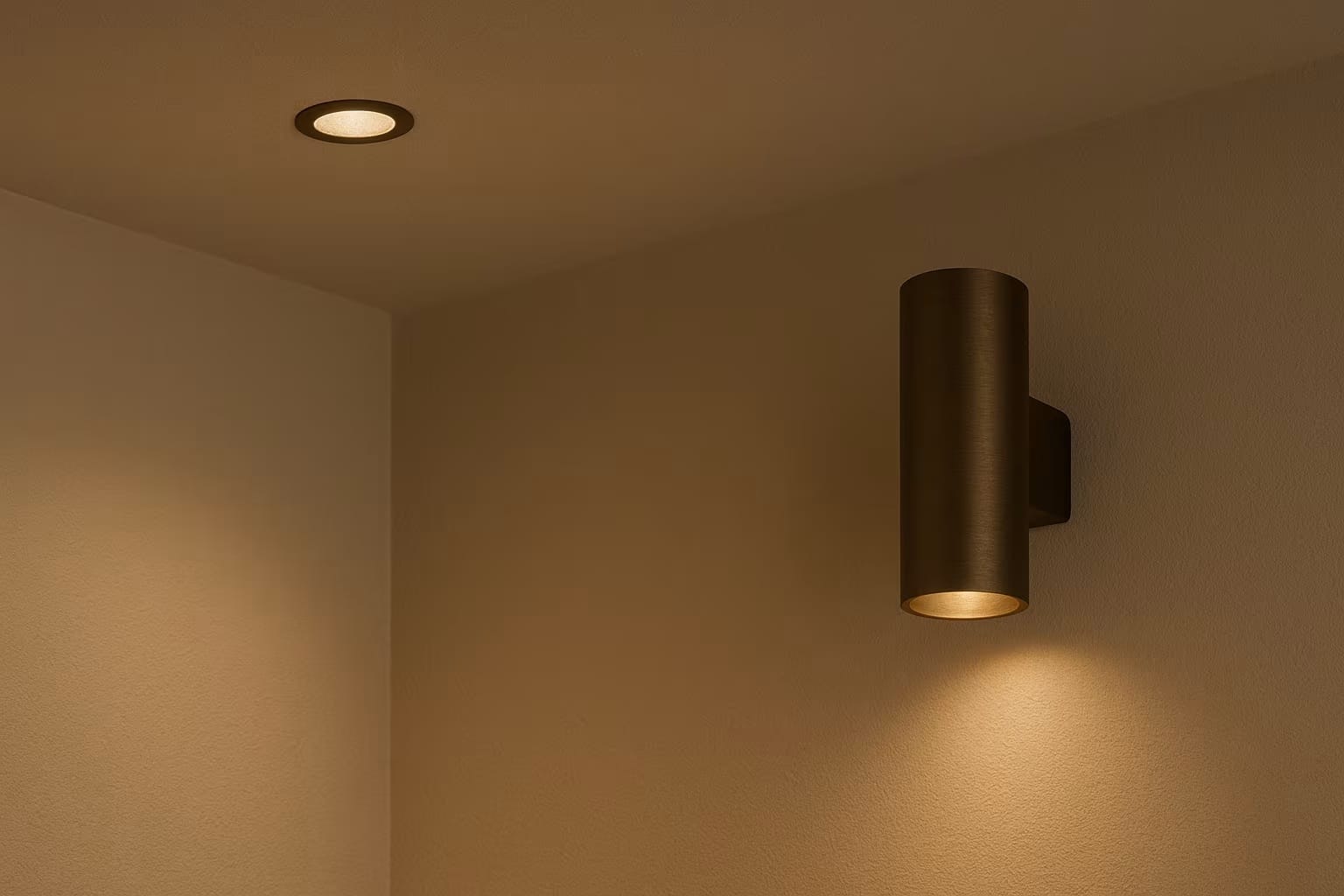 Door de wandlampen te combineren met de bronzen plafondspots ontstaat een harmonieus geheel, waarin materiaal en kleur naadloos op elkaar aansluiten.