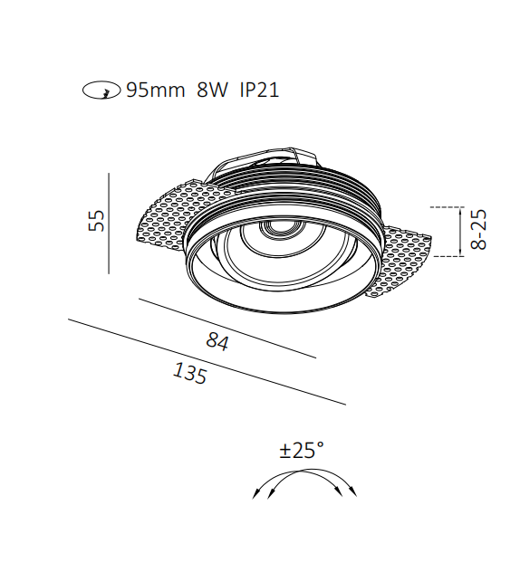 Hoogte lichtbron: De lichtbron kan op twee standen gezet worden. Of gelijk aan het stucwerk of 1cm omhoog.