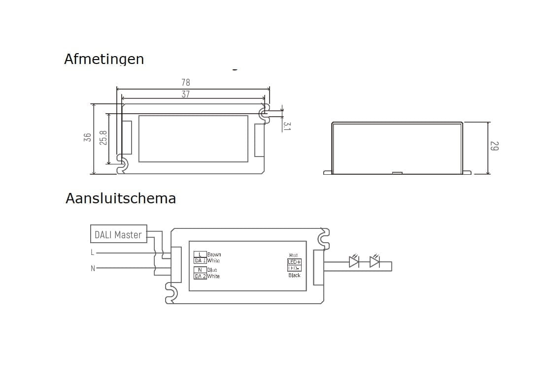 Dit is de kleinste mini dali driver op dit moment met een 12volt uitgang. Deze driver kan aangesloten op een DALI systeem. Wordt gebruikt voor het aansturen van een led strip of andere 12V led producten. 24V op aanvraag Huidige levertijd: 2 tot 3 weken. Minimale afname is 50 stuks. € 30,25 Niet op voorraad Niet op voorraad Technische gegevens – Afmetingen: breedte: 36mm x lengte: 78mm x hoogte: 29mm 1. Een kanaals constante uitgangsspanning, 1A Max